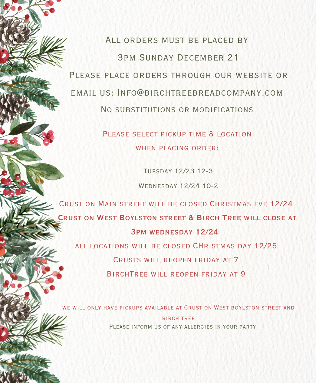 Place your order online here or send an email to info@birchtreebreadcompany.com